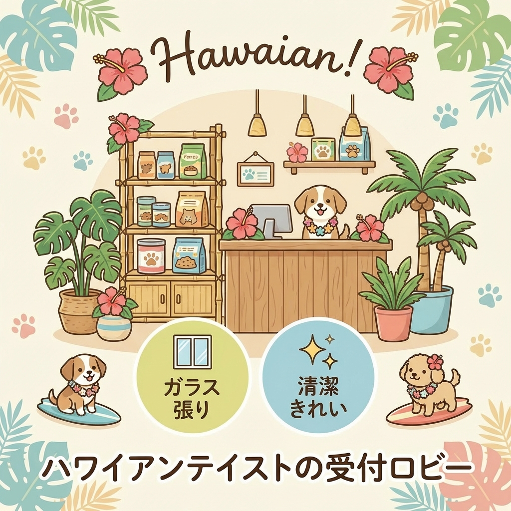 トリミングルームは、店内・店外の両方から飼い主さまにご覧いただけるガラス張りの設計となっており、施術の様子をリアルタイムで確認いただけるため、高い安心感と信頼を得ています。