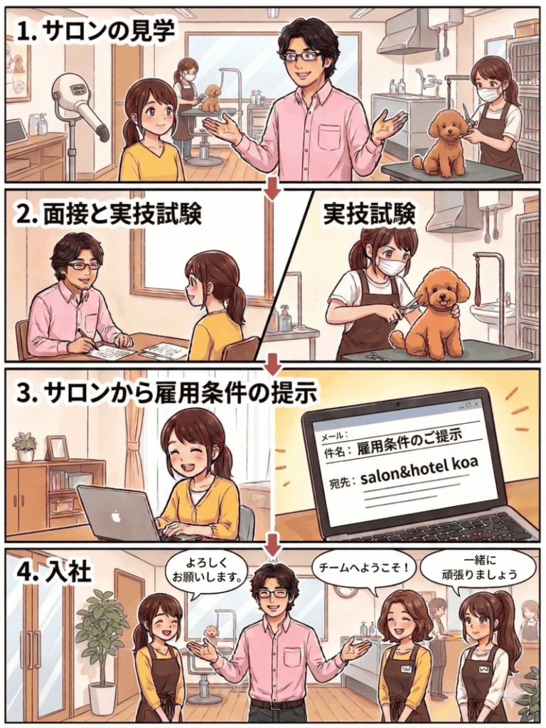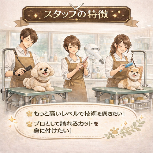 また、経験豊富なスタイリストが多数在籍しており、トリミング技術はもちろん、接客やサロン運営に関するノウハウも、日々の業務の中で自然と学ぶことができます。